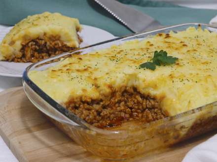Læg kødsovsen i et ildfast fad og dæk den med kartoffelmosen i et jævnt lag. Sæt fadet i den varme ovn i mellem 20 og 30 minutter. Man kan strø ekstra ost ovenpå og give den et par minutters grill.