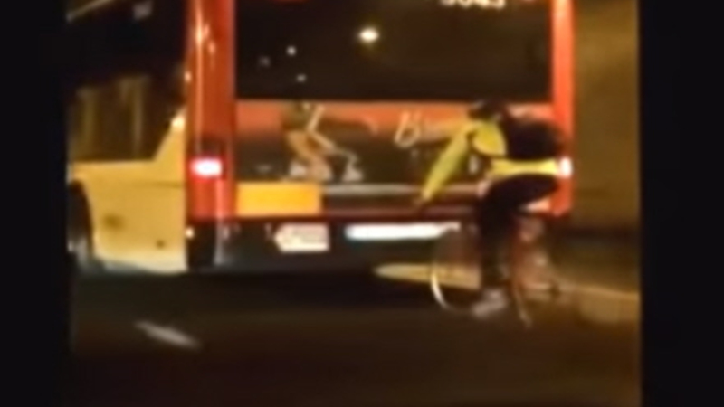 VIDEO: Cyklist kørte 80 kilometer i timen bag en bus, men desværre for den fartglade rytter er kameratelefonen for længst opfundet.