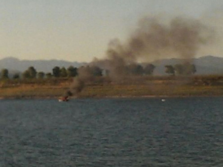 Brandfolk ankom til dæmningen og prøvede at få kontrol over båden, som styrede mod den modsatte bred, der er tæt bevokset af fyrretræer.