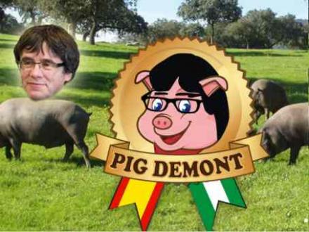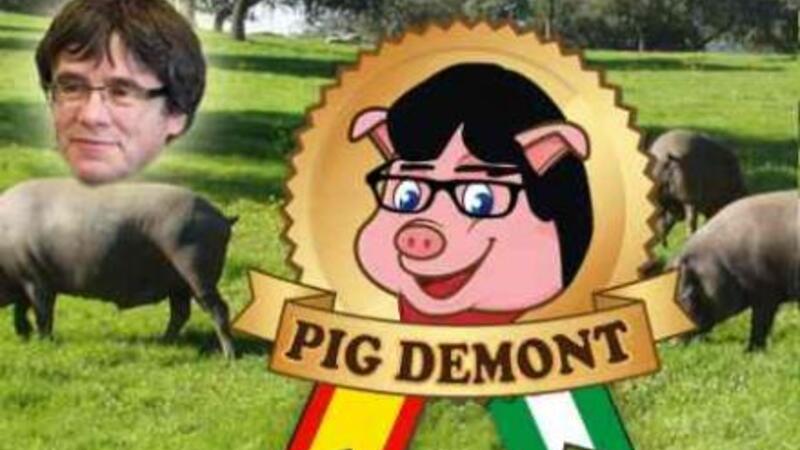 Puigdemont understøtter ligheden med, at den glade gris både har briller og en frisure, der minder om hans.