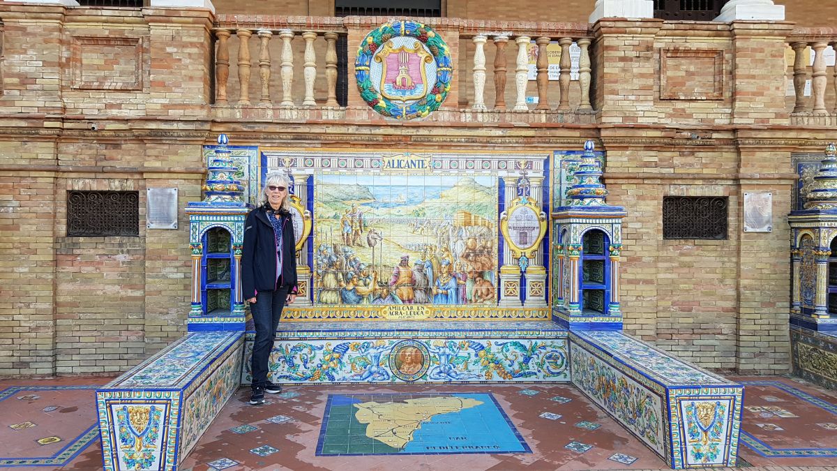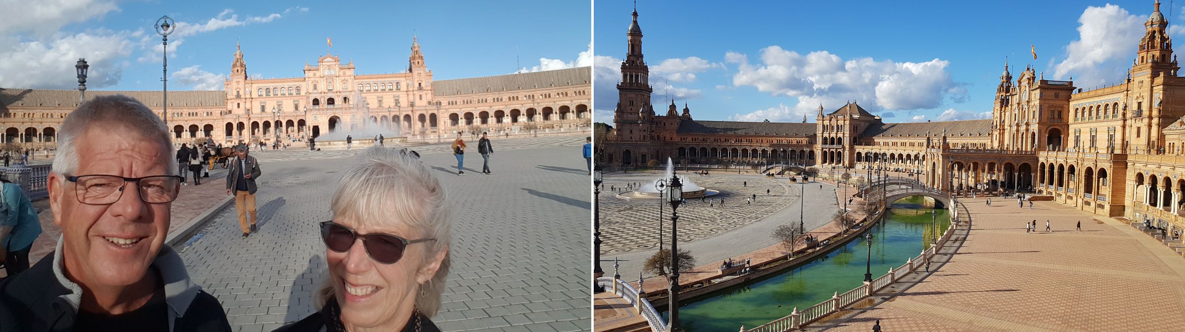 Det hele er bygget i 1928 til den ibero-amerikanske udstilling i 1929. Dengang blev hele den sydlige del af byen omdannet til park med store alléer, forskellige haver, pavilloner, små søer, bænke alle steder, plantager med palmer og andre træarter. Et imponerende sted at gå rundt. Det bliver sen aftensmad, inden vi er tilbage i hjemmet.