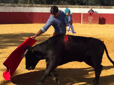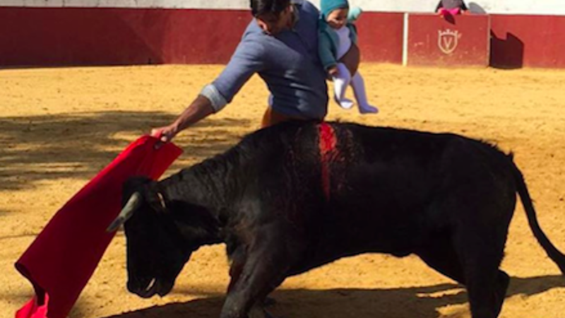 SAMFUND: Billede af en tyrefægter i ringen med en fem-måneder gammel baby på armen har fået folk op i det røde felt.