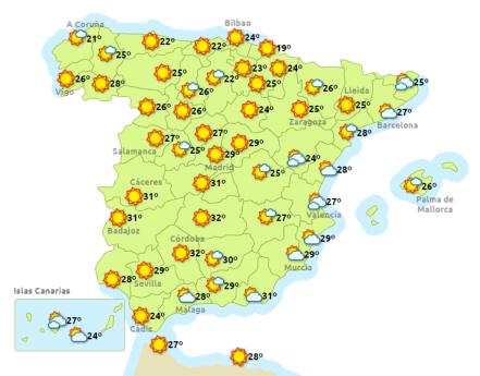 Stort set skyfrit over resten af halvøen og på Balearerne, mens der vil være perioder med overskyet himmel over de nordlige egne af kanarieøerne, letskyet i de sydlige og mulighed for let regn i de højtliggende egne.