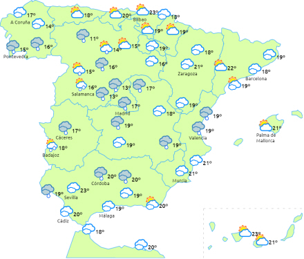 Overskyet himmel med nedbør på halvøen, men det har dog tendens til at aftage i slutningen af dagen. Mest intens nedbør og med torden i Galicien og det vestlige af de indre egne i nord, den cantabriske bjergkæde og bjergene i de indre egne.