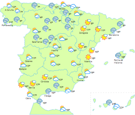 Et ny Atlanterhavsfront bevæger sig fra nordvest til sydøst og efterlader skyet himmel og nedbør til det meste af halvøen og Balearerne. Selv De Kanariske Øer får noget nedbør: