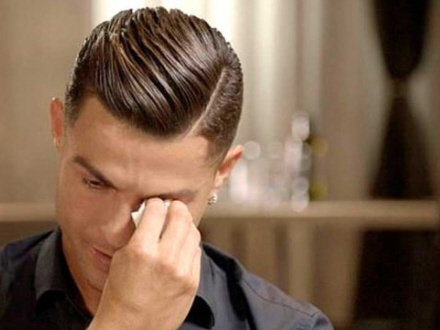 Da intervieweren Piers Morgan så afspiller en video af Ronaldos far, hvor han taler om, at han er meget stolt, er Ronaldo helt færdig, og tårerne pisker ud af øjnene på ham.