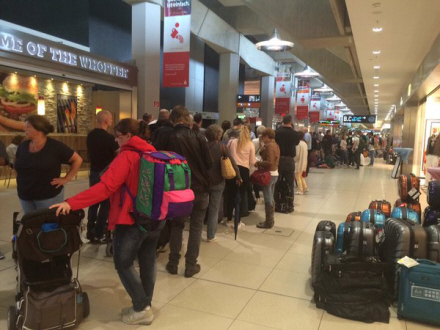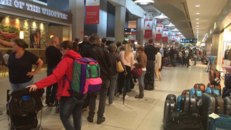 Journalisten Elizabeth Schumacher rapporterede om store køer i lufthavnen, knap en time efter alarmen var blev slået.