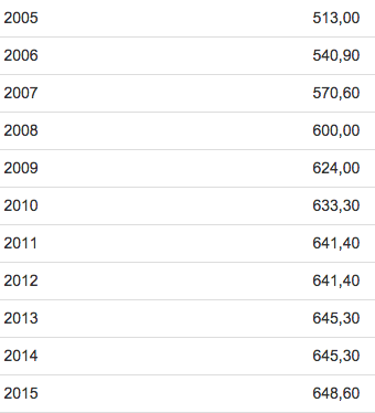 Skemaet viser udviklingen i mindstelønnen siden 2005 i euro.