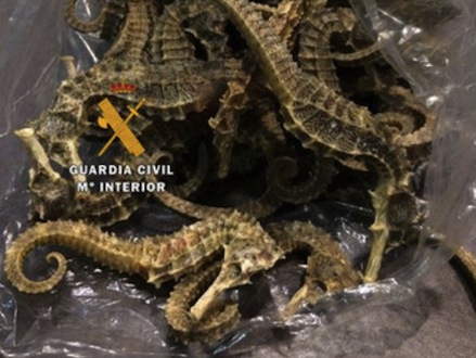 Guardia Civil oplyser, at søhestene blev opdaget i plastikposer skjult i en kinesers kuffert, der var ankommet til Malaga Lufthavn fra Cali i Colombia.