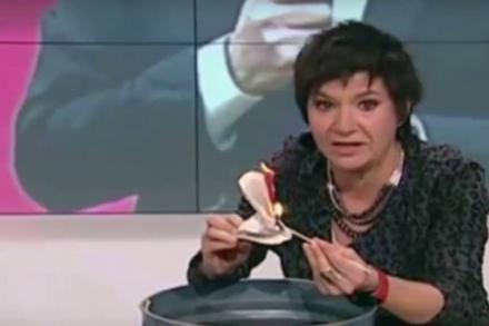 VIDEO: Journalist chokerer, da hun på live-tv river sider ud af den spanske konstitution og sætter ild til dem i protest mod ny lov.