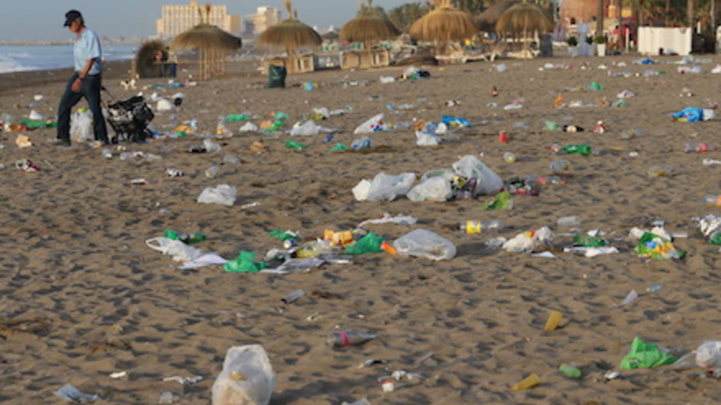 Málagas strande ved daggry var et sørgerligt syn fuld af affald og folk, der tilbragte natten i det fri på stranden.