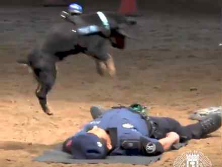 Når dens træner, der optræder med den, falder om og spiller død, kommer Poncho springende med blåt lys ‘på taget’ - dvs spændt fast på ryggen - og giver ham hjertemassage.