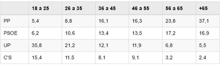 I tabellen fremgår det tydeligt, at jo yngre vælgerne er, desto flere stemmer på de nye partier Ciudadanos og Unidos Podemos. I +65-enden er der stadigvæk stor loyalitet for de gamle partier PP og PSOE.