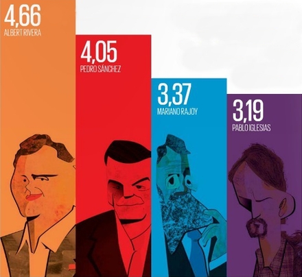 Albert Rivera (Ciudadanos) opnår den højeste karakter på 4,66, Pedro Sánchez (PSOE) ligger nummer to med 4,05, Mariano Rajoy (PP og nuværende premierminister i funktion) klarer 3,37, mens Pablo Iglesias (Unidos Podemos) bunder med 3,19