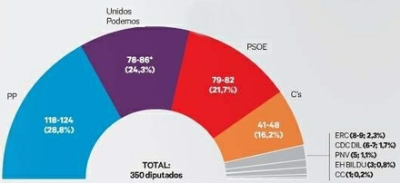 Podemos, der siden valget i december har indgået en koalition med IU, Forenede Venstre, og nu hedder Unidos Podemos, bliver parlamentets næststørste parti med 78 til 86 mandater sammenlignet med 71 mandater for seks måneder siden.