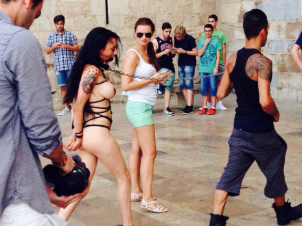 Hændelsen fandt sted torsdag eftermiddag nær det historiske monument, hvor en mand kom gående med en halvnøgen kvinde i snor. Kæden om halsen og den dertilhørende ydmygelse tilfredsstillede åbenbart kvinden. En stor gruppe af forbipasserende standsede op og så måbende til, da den masochistiske scene udspillede sig.