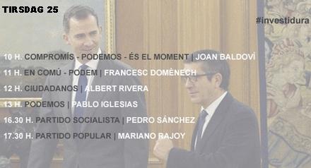 Samtalerne med Kongen sker i den rækkefølge, at de mindste kommer først. Den sidste på dagen er nuværende Premierminister i funktion, Mariano Rajoy.