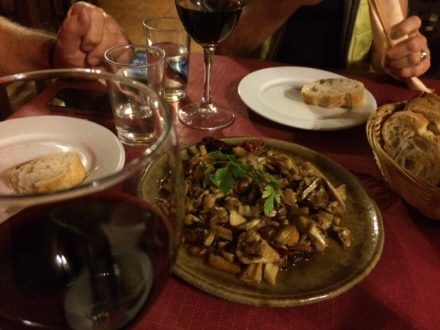 Forskellige svampe, de selv har været ude at samle i skoven, lam og - ja selv kylling i karry er eksotisk og velsmagende ud over alle grænser. Rødvinen er naturligvis også lokal.