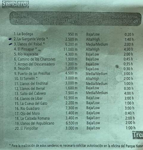 Her gælder først til mølle-princippet, og kontoret har fem permisos at dele ud af om dagen til La Garganta Verde. I den nærliggende by El Bosque (5) har man 25.