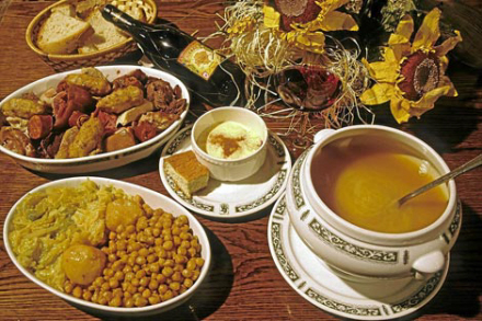 Retterne serveres nemlig baglæns: Først kommer de syv sorter af kød, derefter grøntsager - som regel kål - og endelig suppe og kikærter.