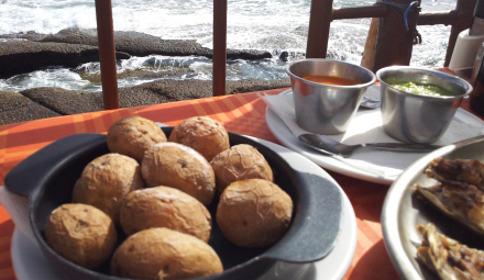 De små kartofler bliver serveret med sovsen Mojo Picón. Ordet stammer fra det portugisiske ord Molho, som betyder sauce.