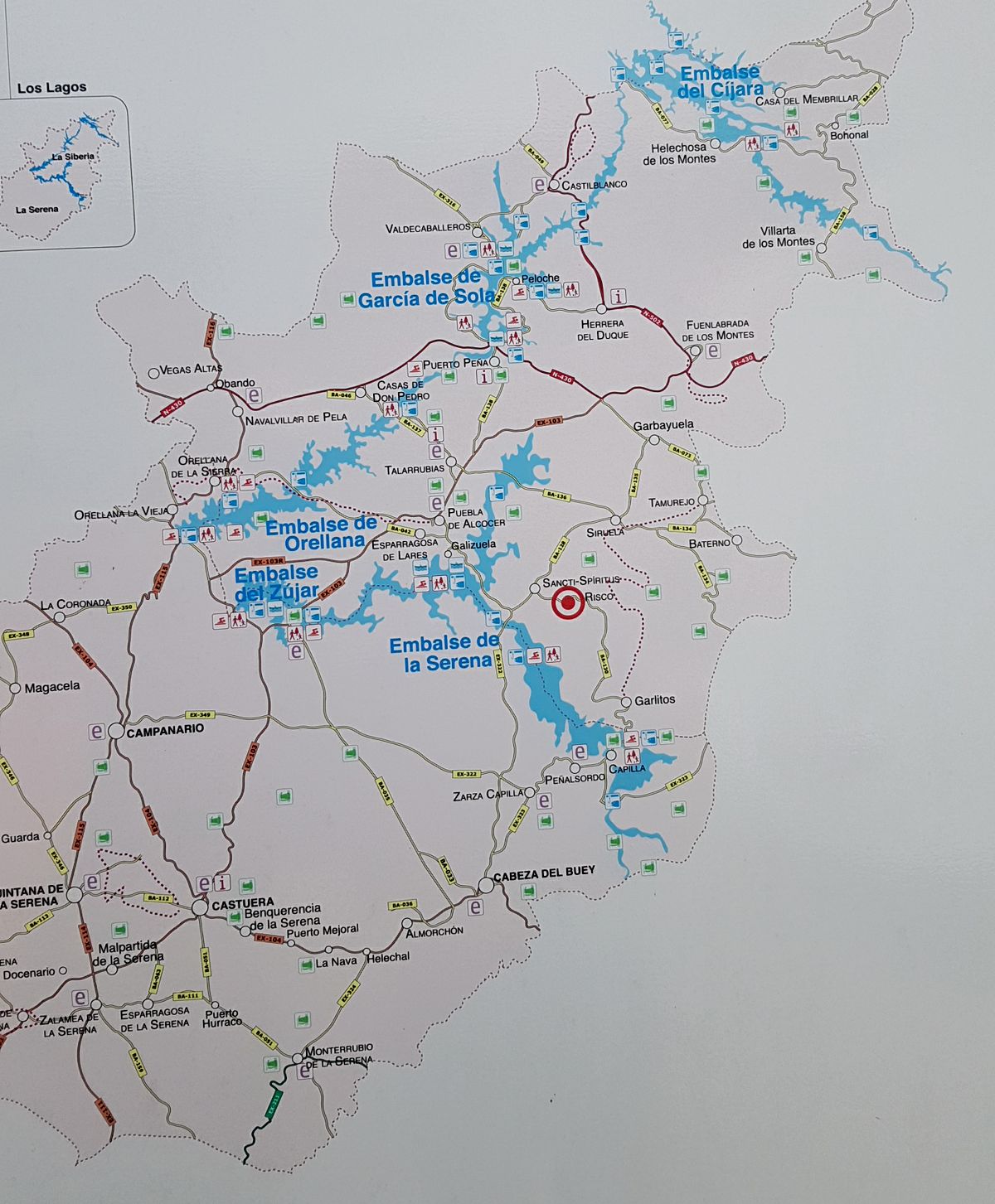 Hvis vi har læst det rigtigt, er det floderne Zújar og Guadálmez, som er dæmmet op og dermed har skabt bassinerne Serena og Zújar. Og Rio Guardiana giver vand til Orellana, Garcia og Cíjara. Der er mange oplysningsplancher, men ikke helt enslydende.