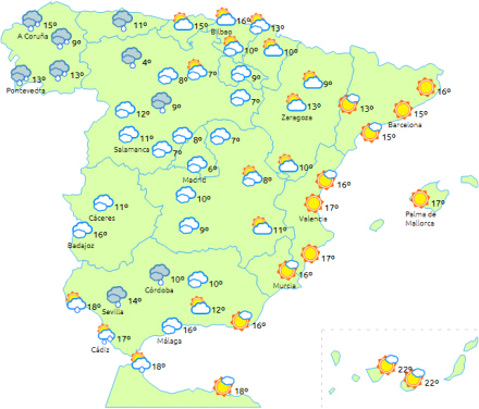 Faldende temperaturer på det meste af halvøen og De Baleariske øer, men det er mest udtalt på den sydlige del af halvøen. Få ændringer på De Kanariske Øer. Svag frost i halvøens indre nordvestlige områder, Pyrenæer og lokalt i andre højtliggende områder af halvøen. Risiko for moderat frost i den nordvestlige del af Castilla y León.