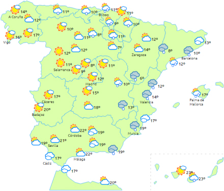 Stigende temperaturer på De Kanariske Øer. Generelt faldende nattemperaturer og fortsat frost i Pyrenæerne, samt de cantabriske og iberiske bjerge.