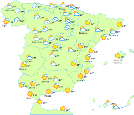 Letskyet eller klar himmel med stigende temperaturer i de indre egne og få ændringer på kysten. Det betyder 23 til 28 grader om dagen og 12 til 15 om natten.