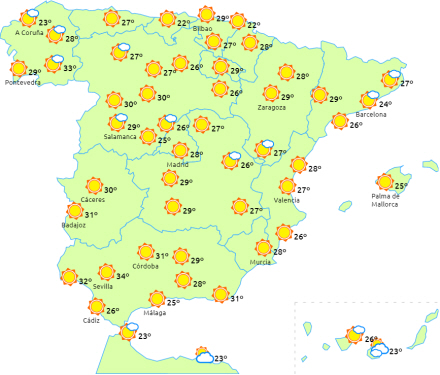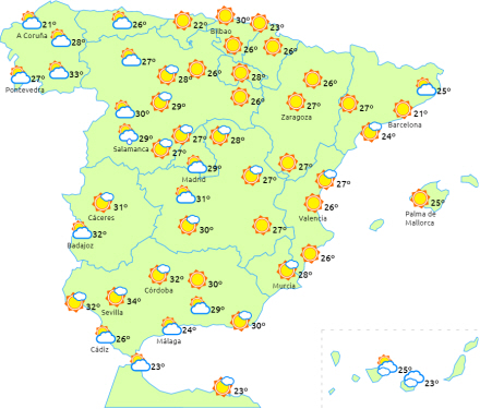 Stigende dagstemperaturer til den østlige halvdel og de indre egne af halvøen - bemærkelsesværdige stigninger i det indre af Valencia samt langs kysten i Galicien, Cantabrien og på De Kanariske Øer. Vi er højere end normalen for årstiden i Galicien, Cantabrien og Castilla y León. Få ændringer i resten.