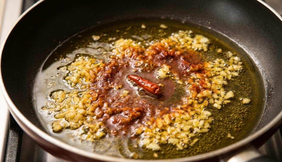 Imens varmes olien op i en dyb pande. Tilsæt paprika, hakket hvidløg og chili, og lad det stege i 5 minutter ved svag varme. Det skal næsten ikke boble, så det bliver tilberedt uden at blive branket.