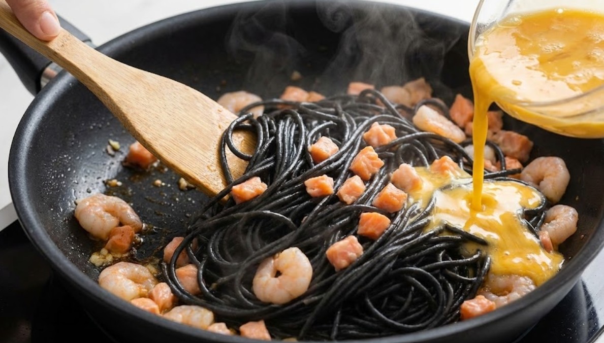 Spaguetti negro con salmón y gambas