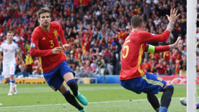 Spanierne jubler over den sene scoring af Pique (nummer to fra venstre)