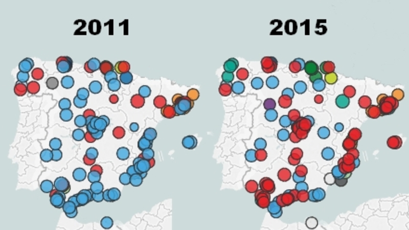 Vi har derfor valgt at få hjælp fra avisen El Confidencial, der har udarbejdet en interaktiv grafik over de enkelte kommunalbestyrelsers valg af borgmestre.