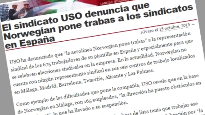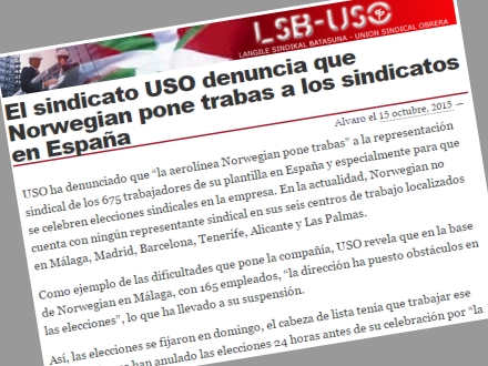 I øjeblikket har medarbejderne ingen repræsentation i nogen af de seks baser, som Norwegian har i henholdsvis Málaga, Madrid, Barcelona, Tenerife, Alicante og Las Palmas, skriver fagforeningen Union Sindical Obrera, USO, i sin pressemeddelelse dateret den 15. oktober 2015.