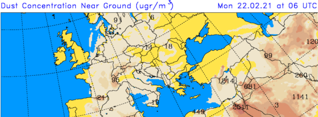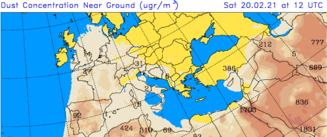 Det er varm vind fra Afrika, der på sin vej gennem Sahara-ørkenen samler en masse støv og sand op, som så forringer sigtbarheden markant og efterlader rødt sand på terrasser og biler.