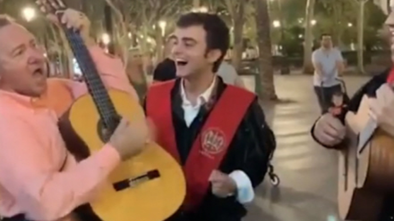 Kæmpe verdensstjerne griber guitaren og skråler med på spanske evergreens midt i turistcentrum. Og dét blev naturligvis fanget på kamera.