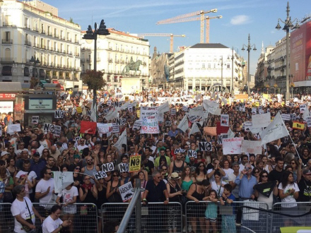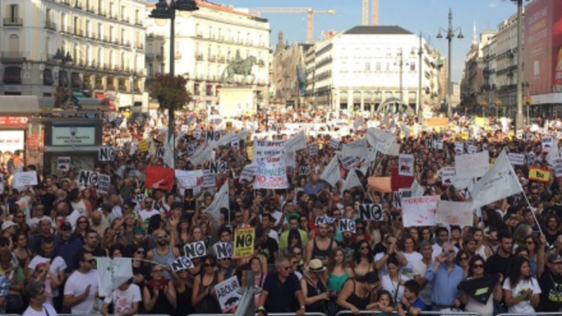 Dette års protest mod det nu forbudte Toro de la Vega-tyreløb er nu rettet mod tyrefægtning i almindelighed. Tusindvis samledes lørdag eftermiddag på Madrids centrale torv, Puerta del Sol.