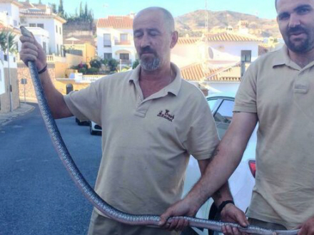 Specialister, der står for indsamling af vilde dyr, der forvilder sig ud af deres normale levesteder, i Costa del Sol-Axarquía har fanget den lange slange, der i øvrigt målte omkring 15 centimeter i diameter. Den havde lagt sig under en bil i et boligkompleks midt i La Cala del Moral.