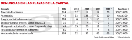 Sager fra Marbella viser, at der ikke er mangel på indberetninger. Alene i løbet af juli kom der 1.266 klager over ulovligt salg på stranden. Heraf var de 996 over ulovlig brug af solsenge, 602 klager over dyr på stranden og 305 over fiskeri uden for de tilladte tider.