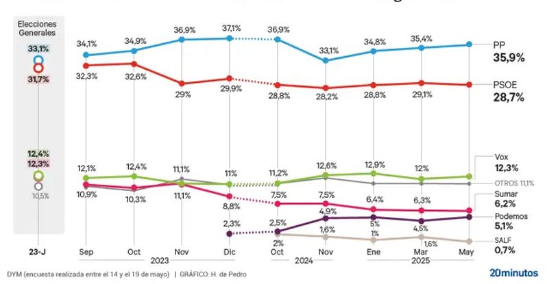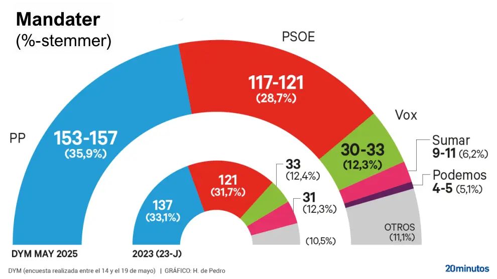 Det fremgår af maj-barometeret udarbejdet af DYM for 20minutos, der viser, at PP fortsætter den opadgående tendens, der begyndte efter det bratte fald, partiet oplevede efter DANA i Valencia i oktober sidste år. Hvis der var valg i morgen, ville PP få 35,9 procent af stemmerne, hvilket er 0,5 procentpoint mere end for et par måneder siden og næsten 3 procentpoint mere end for et halvt år siden. PSOEe vil derimod få 28,7 procent af stemmerne, 0,4 procentpoint mindre end i marts, men med en tendens, der har været stort set stabil med meget små stigninger og fald siden november 2023.