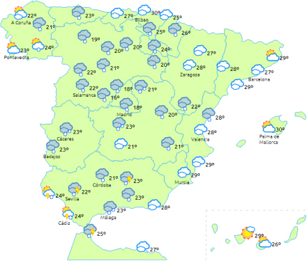 Der forventes skyet eller overskyet himmel over store dele af Atlanterhavområderne, Middelhavsområdet i Andalusien og den nordøstlige del af halvøen med udbredt regn og byger, der kan blive ledsaget af torden. Som nævnt lokalt meget tung eller vedholdende regn ned hagl, men det er dog særligt i bjergrige områder.