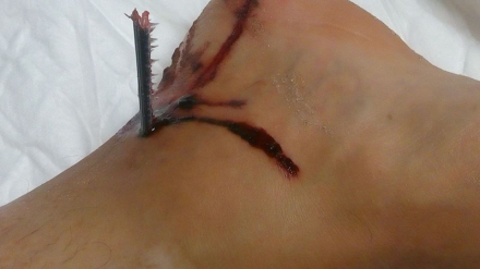 En fisk, der er kendt som 'havnålen' for sin barberblads-lignende mund, der var brækket af og havde sat sig fast, efter den hade spiddet hans ankel.