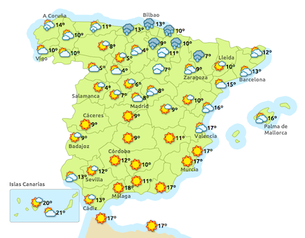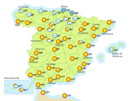 Meteorologisk Institut, Aemet, melder i dag om lokalt moderat frost i Pyrenæerne og vedvarende tåge i de indre, nordlige egne.