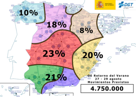Trafikdirektoratet, DGT, advarer om, at den tætte trafik starter i dag klokken 15:00 og står på frem til midnat søndag den 29. august. DGT anslår, at der bliver gennemført 4,75 millioner ture i løbet af weekenden.