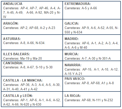 Forvent tæt trafik fra de store byer i regionerne Andalusien, Aragon, Asturien, De Kanariske Øer, Cantabrien, Castilla-La Mancha, Castilla y León, Extremadura, Galicien, Balearerne, Madrid, Murcia, Navarra, Baskerlandet og Rioja.
