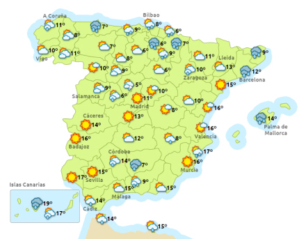 Madrid får en solrig start på dagen, og madrilenerne kan glæde sig over solskinsvejret til ved middagstid, hvor skyerne tager over. I aften ser det ud til, at det kommer til at regne. Temperaturen kommer til at svinge mellem 0 og 12 grader.