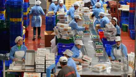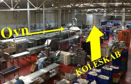 Gennem hele det første store fabrikslokale var der to meterlange ovne, hvor kager kører langsomt igennem. Når de er færdigbagte fortsætter rullebåndet ind i et stort køleskab, hvor de cirkler rundt og kommer ud i den anden ende for så at blive pakket.