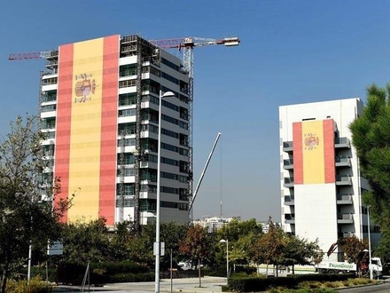 Det største spanske flag, der nogensinde er lavet, blev torsdag, på nationaldagen, foldet ud på et højhus under konstruktion i Valdebebas i Madrid.