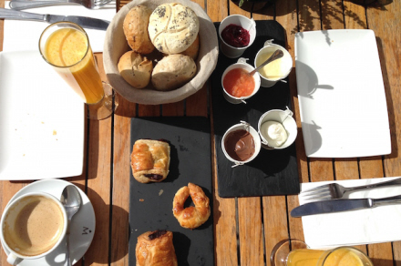 For 20 euro får du: Kaffe, te, frisk juice, kager, brød med Philadelphia, Nutella, marmelade, tomat og olivenolie, æg, laks, landskinke, salater og græsk yoghurt med honning og müesli.